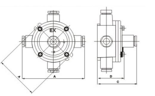 防爆接線盒代號:A一通平、F一通吊 、B直二通平 、G直二通吊 、C三通平、H三通吊 、D四通平 、I四通吊 、E直角二通平、J直角二通吊、